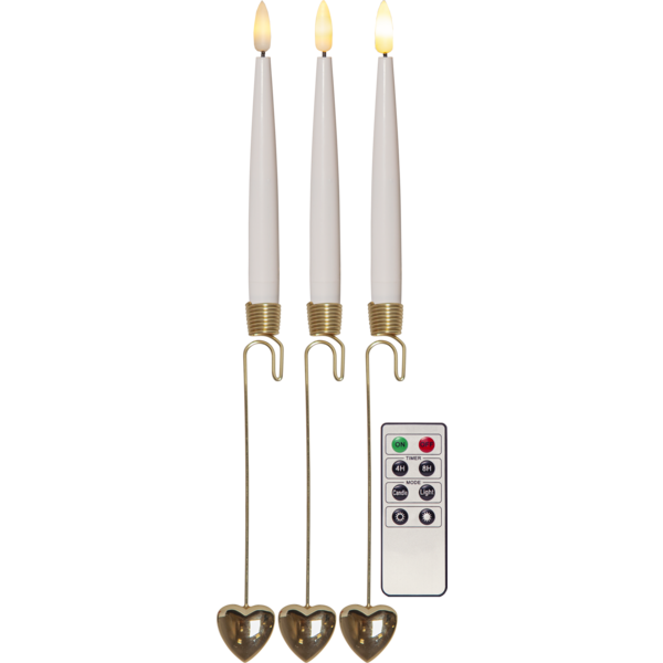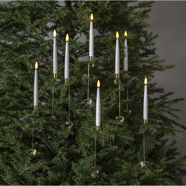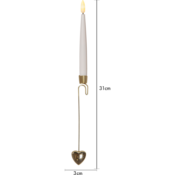 Dekorativ julgransbelysning i form av ett batteridrivet ljus med hållare i guldfärgad metall. För inomhusbruk. Hållaren har en krok för enkel montering i julgranen. Längst ner på hållaren sitter ett dekorativt hjärta. Förpackningen innehåller 8 st vita ljus med hållare. Varje ljus drivs av ett AAA batteri. Fjärrkontroll med timer funktion, justerbar ljusstyrka och val av fast eller flimrande ljus.
