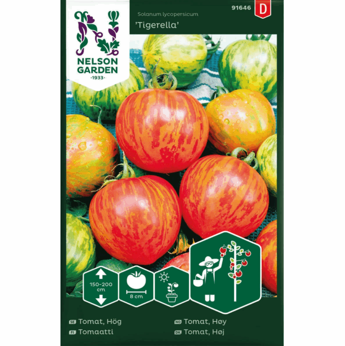 Tomaterna på ’Tigerella’ har ett slående vackert utseende. Frukten är medelstor och färgen är röd med eldigt orangefärgade strimmor. Fruktköttet är fast till mjukt, skalet är tunt. Tigerellatomater har en rik och syrlig smak. Förvänta en stor skörd när du odlar ’Tigerella’.